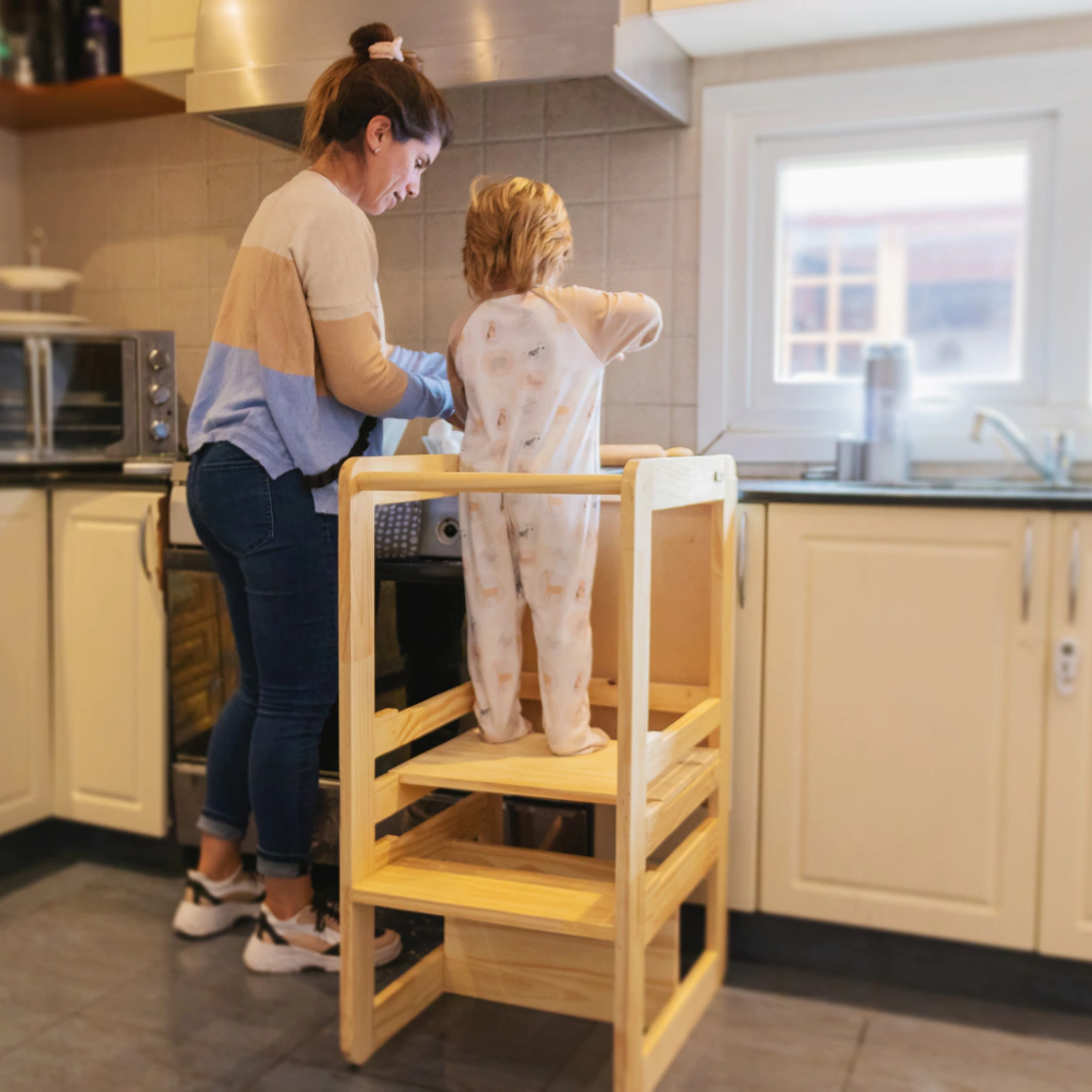 Ahora pueden cocinar juntos en la mesada sin riesgo de que se caiga de la silla, puede comer parado a la misma altura que todos en la mesa, puede cepillarse los dientes solito... y así fomentar su independencia!